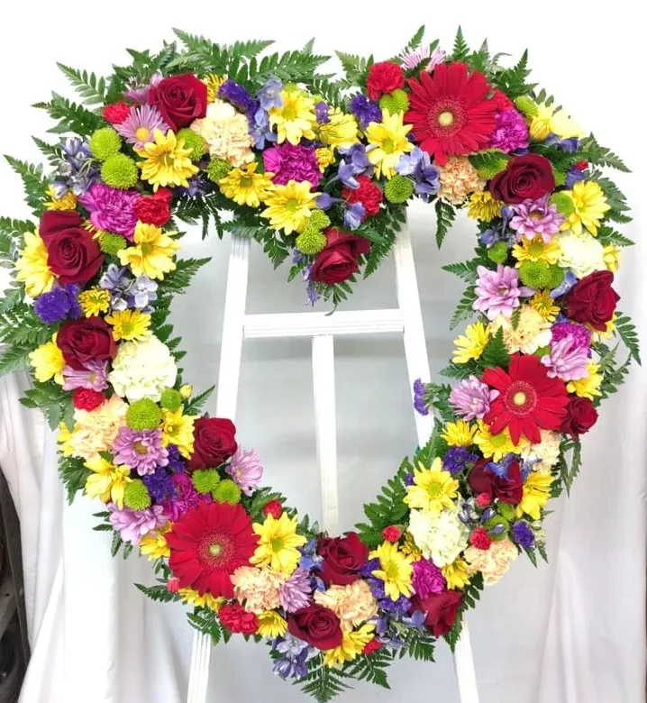 A heart shape wreath with colorful garden flowers. Set on a wood easel.