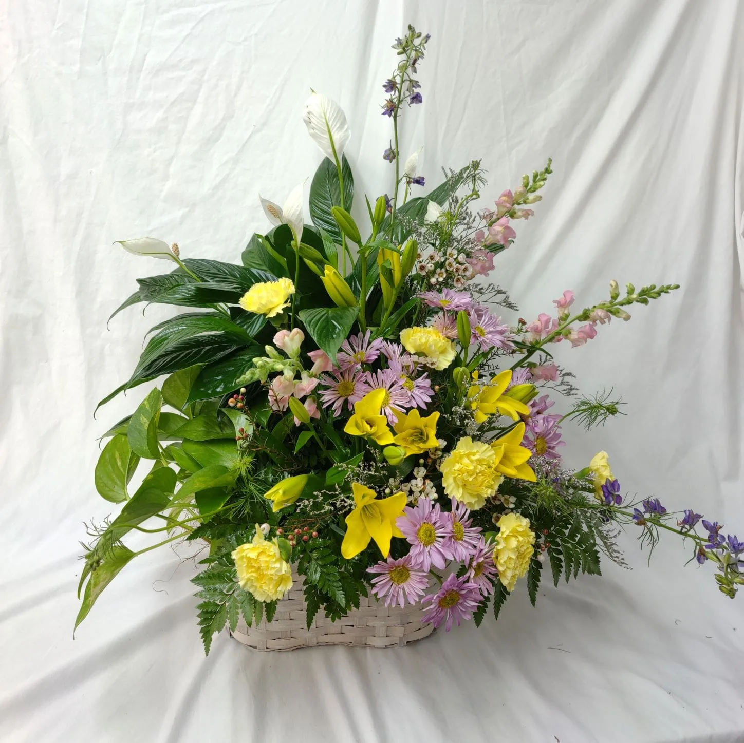 Peace Lily and Pothos plants with a add fresh garden arrangement.